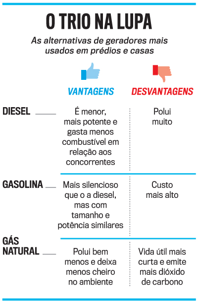 O problema é crônico e preocupante, visto que as capitais brasileiras estão cada vez mais adensadas. Em 2023, por exemplo, o brasileiro ficou em média nove horas e 36 minutos no escuro, de acordo com a Agência Nacional de Energia Elétrica — os dados de 2024 estão sendo compilados. É problema antigo, desdenhado com insistência. Lembre-se que, em 2000, foram dezoito horas e 46 minutos sem luz. O que fazer, se as soluções não chegam? O jeitinho brasileiro, ainda que resulte em evidente passo atrás no necessário cuidado ambiental (veja a comparação de três modelos de geradores no quadro).