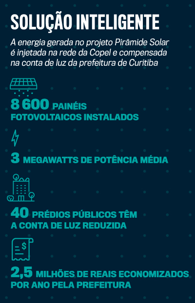 A Pirâmide Solar é parte de um esforço mais amplo para acelerar a geração de energia renovável em prédios públicos. Além do Caximba, escolas municipais, unidades de saúde e terminais de ônibus passaram a receber painéis fotovoltaicos desde 2022, reduzindo em 15%, em média, o custo anual da energia elétrica consumida por esses equipamentos. A prefeitura também investe em usinas distribuídas em pontos específicos, como a instalada na Fazenda Urbana do Cajuru. Além de gerar energia, esse espaço funciona como centro de educação ambiental e formação em agricultura urbana, promovendo a economia solidária e a inclusão social. A meta da administração municipal é alcançar a autossuficiência energética em 100% dos prédios públicos até 2030. Em 2024, a prefeitura firmou parceria com instituições financeiras internacionais, assegurando 600 milhões de reais em crédito por meio do programa Curitiba Carbono Neutro, para tornar viáveis projetos de energia solar e modernização da frota de transporte coletivo. “As cidades têm capacidade de criar soluções rápidas e, por isso, são fundamentais no enfrentamento da crise climática”, diz Marilza Dias, secretária municipal do Meio Ambiente de Curitiba.