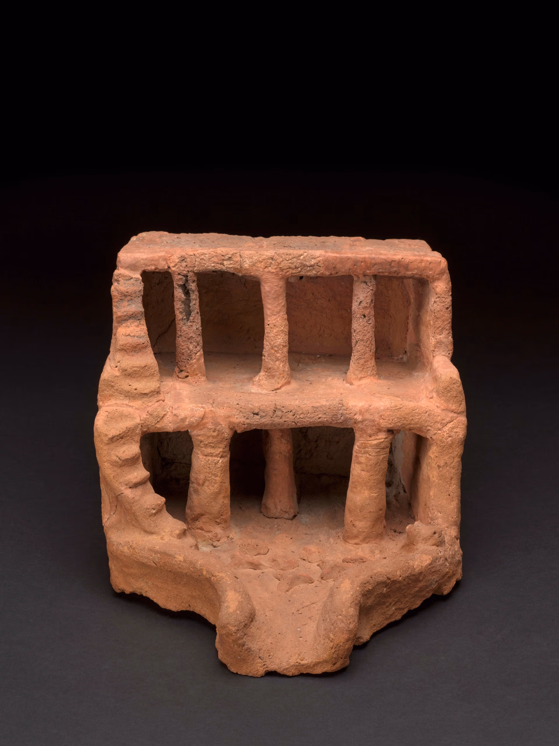 A estrutura era moldada sobre uma armação de gravetos, que queimava durante a queima em forno, criando vãos internos. Escadas e colunas eram esculpidas à mão com a argila ainda úmida, e é nesse momento que o artesão teria deixado a impressão da mão.