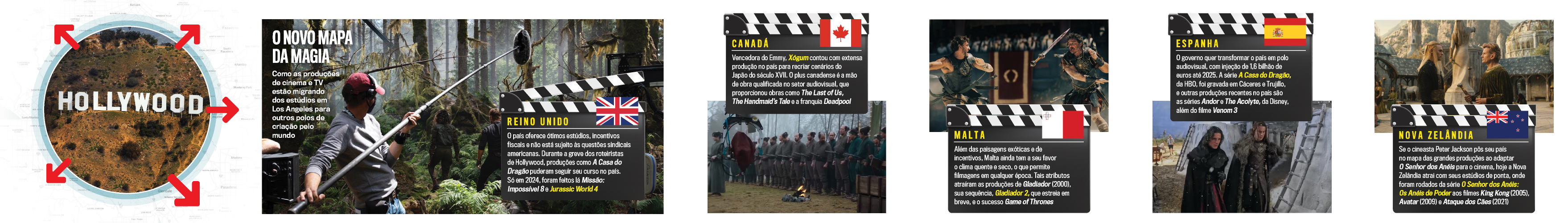 Olhando além do horizonte mítico, mas custoso de Los Angeles, as produtoras perceberam o potencial oferecido mundo afora (leia o quadro). Principalmente em locais como Reino Unido, onde Game of Thrones e outros arrasa-quarteirões foram filmados; Malta, arquipélago no Mediterrâneo onde ficou o set de Gladiador e de sua sequência, que estreia em 14 de novembro; e até Nova Zelândia, lar de Peter Jackson, cineasta que projetou seu país ao adaptar O Senhor dos Anéis para o cinema por lá — agora, o Prime Video, da Amazon, foi até a Oceania para rodar a série derivada Os Anéis de Poder.