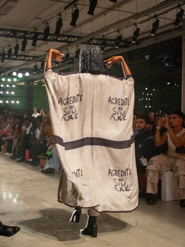 No ponto alto da apresentação, Marcia Pantera, uma das mais importantes drag queens brasileiras que despontou nos anos 1990 e desfilou para Alexandre Herchcovich, surgiu coberta por fitas brancas de Nosso Senhor do Bonfim. Atravessou a passarela (e os movimentos remetiam aos zambetos, guardiões das comunidades Ogu no sul do Benim) antes de revelar um look digno de uma batalha de Vogue.