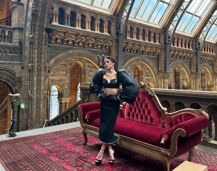 Em suas redes, Jenna Ortega já deu pistas do que viria por aí no Museu de História Natural (onde mais Wandinha passaria uma tarde em Londres?), quando trocou seu visual habitual pelos designs esculturais da Givenchy de Sarah Burton (a favorita de Kate Middleton) com look de luvas acolchoadas exageradas (ou poderíamos chamá-las de mangas?) e um sutiã de couro estilo bala.