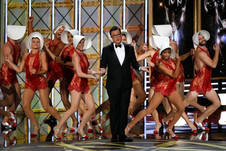 21:08: Conhecido por seu humor ácido contra o presidente americano Donald Trump, Colbert começou o ataque. “São mais de 450 produções. Ninguém consegue ver tanta televisão, a não ser o nosso presidente. Boa noite, majestade!”, disse.