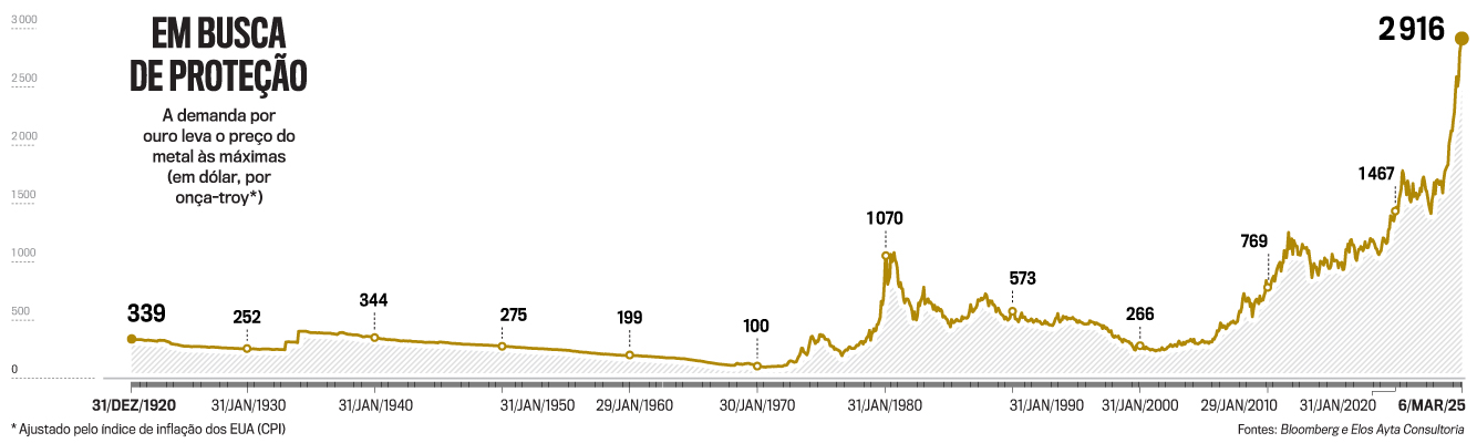 O ouro físico tem pouca atratividade para os investidores. A forte demanda pela commodity está concentrada nos contratos negociados em bolsa, impulsionados principalmente por sua alta liquidez. É nesse ambiente que se observa um movimento recorde: os preços do ouro já ultrapassaram os 3 000 dólares por onça-troy (unidade de medida utilizada para pesar metais preciosos), atingindo o maior patamar da série histórica iniciada na década de 1970. Mesmo quando ajustado pela inflação dos Estados Unidos, o valor do ouro segue no nível mais alto já registrado, segundo um estudo realizado pela consultoria Elos Ayta.