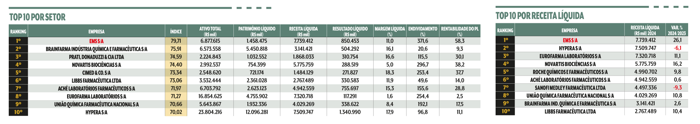 A trajetória da EMS é daquelas que raramente se veem na indústria farmacêutica. Criada em 1964 pelo empreendedor Emiliano Sanchez, a empresa saiu das prateleiras modestas de um pequeno laboratório para ocupar o topo do mercado brasileiro… — e agora mira o mundo. Com receita líquida de 7,7 bilhões de reais em 2024, é a maior do setor por esse indicador. Seu lucro líquido de 850 milhões, com retorno de 58% sobre o patrimônio, está entre os motivos de despontar como a melhor das farmacêuticas neste ranking das TOP30. O impulso mais recente vem de um filão que revolucionou o negócio global de medicamentos: os tratamentos contra obesidade e diabetes, área que transformou a dinamarquesa Novo Nordisk em ícone de inovação e rentabilidade.