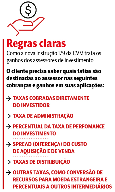 Na versão mais recente da resolução 179 da CVM, ainda em adaptação, as assessorias deverão discriminar os ganhos dos intermediários de investimento em cada produto financeiro, além dos acordos que eles têm com as empresas distribuidoras. Também será obrigatório o envio de relatórios trimestrais aos clientes em que as cobranças atreladas a cada investimento são informadas.