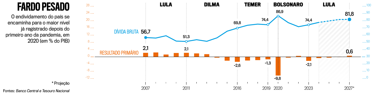 A dívida pública, que estava em pouco mais de 50% do produto interno bruto no início da década passada, se aproxima hoje em dia dos 80%, e está crescendo. Trata-se de um grau de endividamento que só não é maior que o do auge da pandemia, em 2020, e que o Brasil não enfrentava desde as suas grandes crises de dívida do século XX, um passado que já tinha sido superado e que volta a agora a assombrar. É também uma trajetória rápida rumo ao que seria o limite de tolerância da dívida pública no Brasil, estimada em algo entre 80% e 90% pelos pesquisadores que se debruçam sobre o tema. “Não é um número exato de calcular, mas sabemos que é um limite bem mais baixo que o dos países desenvolvidos, que têm muito mais folga financeira”, afirma Rodrigo Pereira, pesquisador do Instituto de Pesquisa Econômica Aplicada e que foi assessor no Ministério da Economia de Paulo Guedes. É o recorte aproximado a partir do qual a dívida toma desproporção tal que, se o governo não descamba de vez para um calote, entra ao menos em uma zona de desconfiança em que não consegue mais encontrar comprador para seus títulos e se vê obrigado a colocar juros cada vez mais altos sobre eles. E é, em boa medida, o que já está acontecendo.