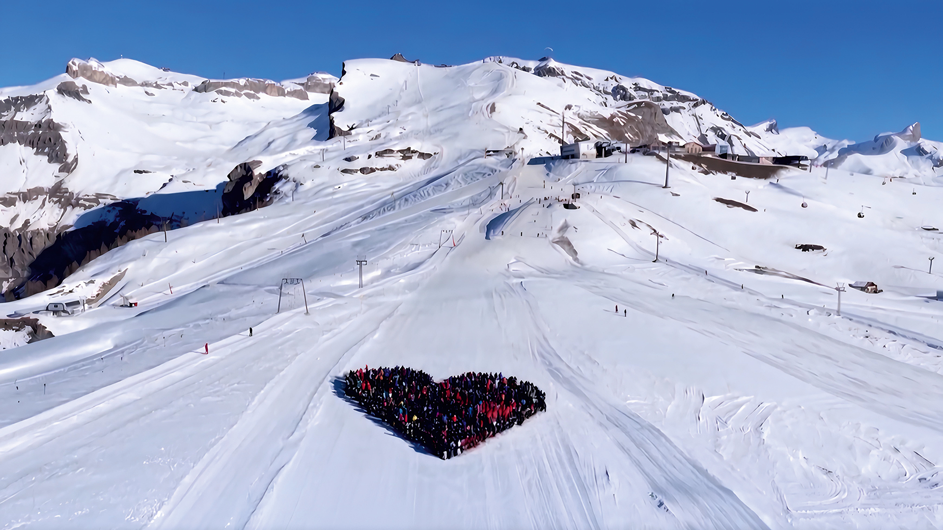 Numa estação próxima ao desastre, centenas de esquiadores formaram um coração, em registro que só pôde ser feito em sua grandeza por meio de drones