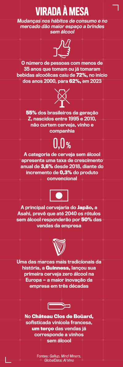 Atenta, a indústria busca se adaptar ao novo cenário. Nos bares pelo mundo, há uma demanda cada vez maior por mocktails, os coquetéis sem álcool. Na Irlanda, por sua vez, a St. James’s Gate Brewery criou, no ano passado, uma versão zero da centenária cerveja Guinness, enquanto no Brasil as estimativas de venda de cervejas sem álcool chegaram a 480 milhões de litros em 2024 — um crescimento de mais de 20% em relação ao ano anterior. Hoje, até o segmento de vinhos sem álcool, quem diria, ganha escala.