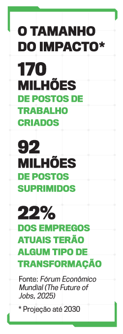 Um levantamento do Fórum Econômico Mundial, o Future of Jobs 2025, elaborado a partir da perspectiva de 1 000 empregadores, de 22 atividades distintas, representando mais de 14 milhões de trabalhadores em todo o mundo, traz informações reveladoras: até 2030, 22% dos empregos serão dizimados, em um total de 92 milhões de posições. No entanto, 170 milhões serão criados a partir das inovações, de atividades que nem mesmo existem, ainda. Tendem a ser subtraídas as profissões rotineiras, baseadas em regras rígidas, em processos repetitivos. Permanecerão vivíssimas as ocupações que pressupõem contato com gente de carne e osso, sensibilidade e habilidades de leitura e escrita. Adeus, em breve, a atendentes de telemarketing e corretores de seguro, por exemplo. Assistentes sociais e artistas, porém, terão longa vida (veja no quadro). O Goldman Sachs estima que 46% das tarefas administrativas e 44% das atividades jurídicas poderão ser automatizadas na próxima década. Nos setores financeiro e jurídico, funções como análise de contratos, detecção de fraudes e consultoria financeira estão sendo cada vez mais desempenhadas por sistemas de IA. Bill Gates, o sujeito por trás de parte da origem de tudo o que vemos por aí, tem um prognóstico: a semana de trabalho de dois dias, a partir da onipresença digital, é uma possibilidade nos próximos dez anos.
